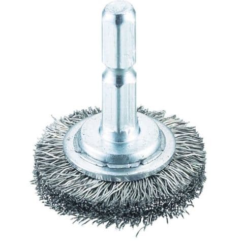 ・六角軸付のホイール(円盤型)ブラシ・ブラシ形状が円盤型で、外側に向かって放射状に毛が植わっています。・ステンレス線なので金属面などにサビが出にくいです。