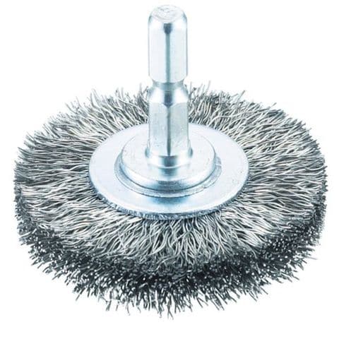 ・六角軸付のホイール(円盤型)ブラシ・ブラシ形状が円盤型で、外側に向かって放射状に毛が植わっています。・ステンレス線なので金属面などにサビが出にくいです。