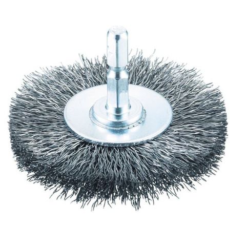 ・六角軸付のホイール(円盤型)ブラシ・ブラシ形状が円盤型で、外側に向かって放射状に毛が植わっています。