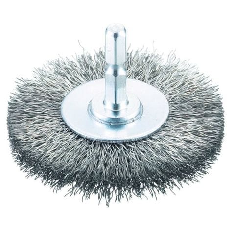 ・六角軸付のホイール(円盤型)ブラシ・ブラシ形状が円盤型で、外側に向かって放射状に毛が植わっています。・ステンレス線なので金属面などにサビが出にくいです。