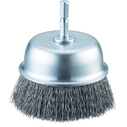 ・六角軸付のカップ型ブラシ・ブラシ形状がカップ型で、下面に向かって毛が植わっています。・比較的広い面の作業向きです。
