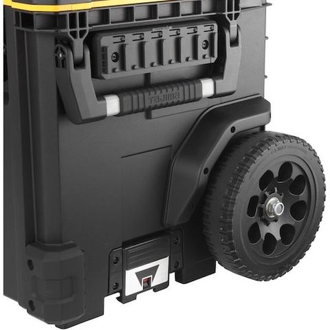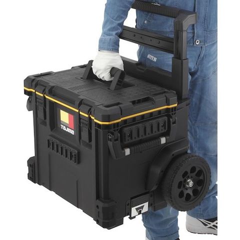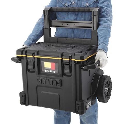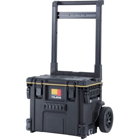 ・キャリー付きツールボックス・内側・外側にセフホルダー機能を搭載・腰周りの「着脱セフ」商品をまるまる一式収納できる大容量仕様・重ねて置くだけでしっかり連結する荷崩れ防止設計・運搬の安定性を高めた高耐久ワイドキャリーハンドル&大型タイヤ・片手持ち、両手持ちが可能な2way ハンドル・IP65 準拠の防塵・防水仕様