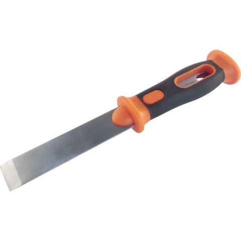 ・ハンドルには握り心地の良いサーモプラスチックラバーを使用しています。・刀身が刃先から衝撃部まで貫通しているため、ハンマーで叩いた衝撃力がダイレクトに刃先に伝わります。・滑りにくいチェッカリングと上下にツバをつけたハンドル形状でハンマーの衝撃から手を守ります。・汚れにくく割れにくいPP樹脂ハンドルと握り心地の良いサーモプラスチックラバーを採用しています。