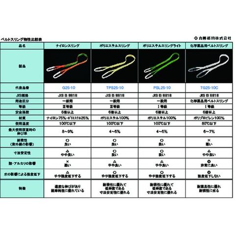 ・荷物の鋭利な角や摩擦によってベルトスリングなどの繊維スリングを傷つける恐れがある箇所には必ず当て物を使用してください。・当て物を使用していても荷物の横滑り、周囲の壁や物への接触、加圧などによりスリングが損傷及び切断する可能性がありますので作業環境には十分に注意してご注意してご使用ください。・繊維製品ですので寸法に多少の誤差があります。2本組などで厳密な長さ揃えが必要な場合には事前にご相談ください。