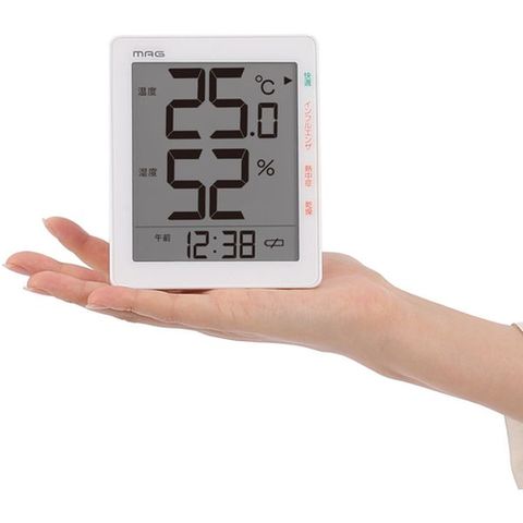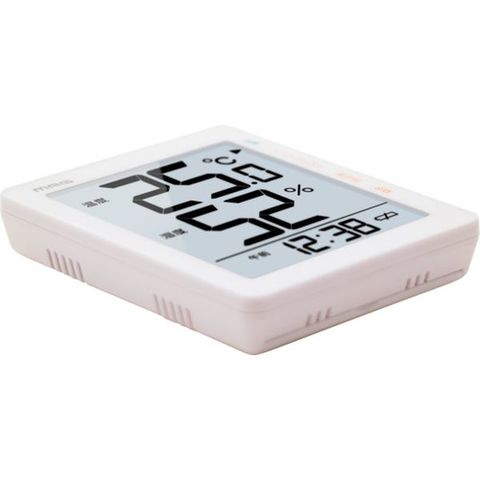 ・温度表示(-9.9~+50℃)、湿度表示(10~95%RH)、時刻表示、12/24時間表示切替、環境目安表示(快適/インフルエンザ/熱中症/乾燥)、最高最低温度湿度表示、電池交換お知らせ表示、置掛両用・電源:単4乾電池×2本(付属)