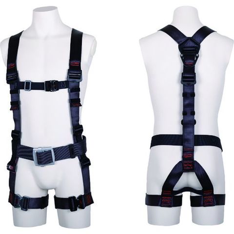 ・胴ベルト部に道具取り付けスペースを幅広く確保したY型のフルハーネスで、多くの工具類を必要とする作業に最適です。・腿部は左右が独立しているので束縛感が少なく、動きやすさを高める水平型腿ベルトです。・ベルトの長さの調節範囲を広く取っているため、夏服・冬服でもピッタリ装着が可能です。・胴ベルトは3点支持なので腰の道具取付スペースが大きく、バランスが良いです。・ベルト素材にナイロンを使用し大変滑らかです。