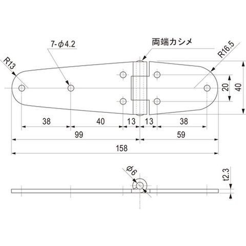 ・全長(mm):158・幅(mm):40・厚さ(mm):2.3・ねじ穴数:7・穴径(mm):Φ4.2・耐荷重(kg)2個使用時:10・取付方法:ビス止め・下穴径(mm):Φ4.2