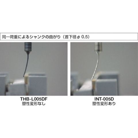 ・仕上げ加工・面取り用です。・特殊高硬度処理ステンレスシャンクにより、しっかりとした手応えと、しなやかさを兼ね備えたシャンクを実現します。・表層硬度(Hv1000以上)を超硬並に近づけることにより、変形や折損を大幅に低減します。・弾力性のアップにより、折損しにくいシャンクを実現します。・シャンクの曲がりが少ないため、精密加工が可能です。・高荷重での作業が可能なため、加工時間が大幅に短縮します。・従来品に比べ、約2倍の圧力での加工が可能です。(当社比)