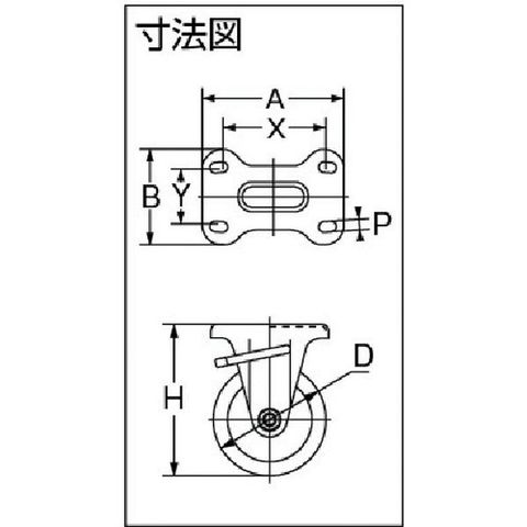 ・車輪径D(mm):200・タイプ:固定式(ストッパー付)・許容荷重(daN):250・許容荷重(kgf):255・車輪幅(mm):46・取付高H(mm):250・取付座A(mm):155・取付座B(mm):102・取付ピッチX(mm):112~119・取付ピッチY(mm):56~63・取付穴径P(mm):11.5・許容荷重(N):2500