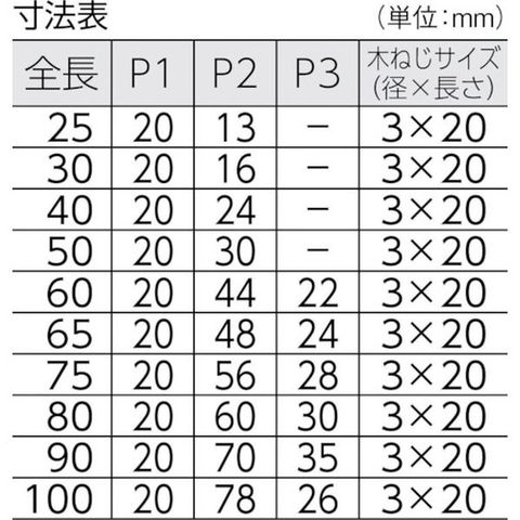 ・全長(mm):80・幅(mm):32・厚み(mm):1.5・ねじ穴数:6・穴径(mm):3.2・耐荷重(kg)2個使用時:12・木ねじ入数:-・D2(mm):6.3