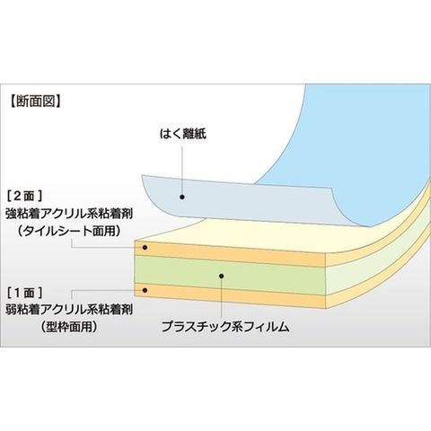 ・表裏異なる粘着剤を使用してる為タイルシートの型枠固定に最適です。・1面は弱粘着剤を塗布しており、型枠面用です。・2面は強粘着剤を塗布しており、タイルシート面用です。・直線カット性に優れた基材を使用しているので手切れ性が抜群です。