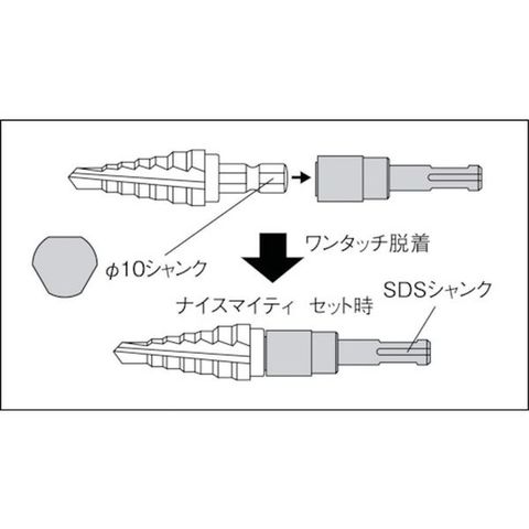 ・ナイスマイティステップドリル(φ10シャンク)のシャンクをワンタッチでSDSシャンクに変換できます。・SDSプラスドリルに対応しています。