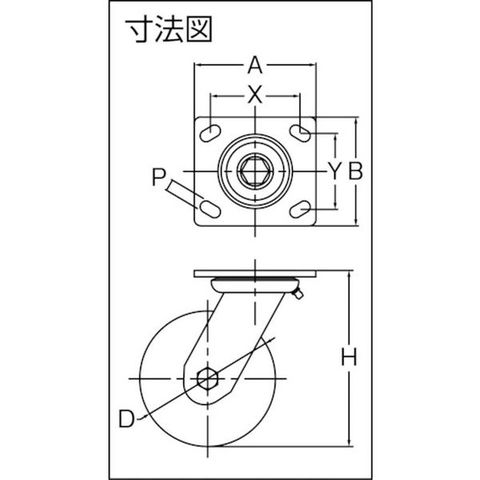 ・車輪径D(mm):127・タイプ:自在式・許容荷重(daN):333・許容荷重(kgf):340・車輪幅(mm):50・取付高H(mm):165・取付座A(mm):114・取付座B(mm):102・取付穴径P(mm):10・取付ピッチX×Y(mm):92×67(76×76)
