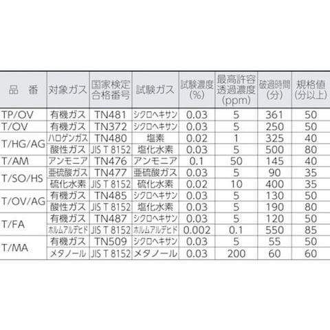 ・対象ガス:有機ガス・適合機種:TW099、TW088、TW022Sd、TW08SFII、TW08S、TW02SF、TW02S、TW02、TW11C、TW01SFC、TW01SC、TW01S、TW01C、TW01・国家検定合格番号:TN481・破過時間(分):361・規格値(分以上):50・試験ガス:シクロヘキサン・試験濃度(%):0.03・最高許容透過濃度(ppm):5