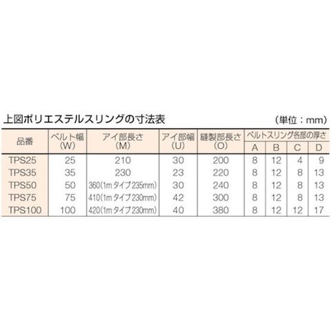 ・TPS75-10、TPS75-15はJIS規格外品です。・使用可能温度100℃以下・繊維製品ですので寸法に多少の誤差があります。2本組などで厳密な長さ揃えが必要な場合には事前にご相談ください。・荷物の鋭利な角や摩擦によってベルトスリングなどの繊維スリングを傷つける恐れがある箇所には、必ずコーナーパッドなどの当て物を使用してください。・当て物を使用していても荷物の横滑りや周囲の壁や物への接触、加圧などによりスリングが損傷および切断する可能性がありますので作業環境には十分に注意してご使用ください。