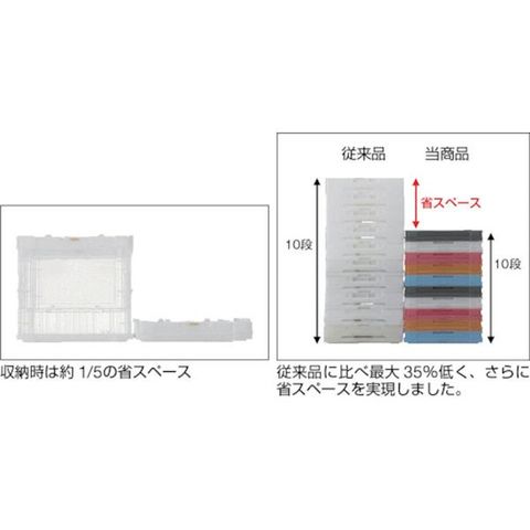・中が透けて見えるため、コンテナの中身が判別しやすく、保管・管理に最適です。・折りたたんだ時の高さを最大限まで追求、従来タイプに比べて最大35%低く、これにより輸送運賃・保管スペースを大幅に削減することができます。・組み立て時も、折りたたみ時にも積み重ねができ荷崩れの心配がありません。