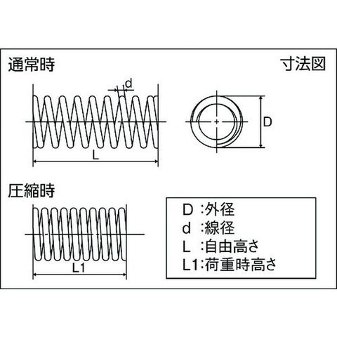 ・間隔をあけて線材をらせん状に巻いた、圧縮する方向に使うばねです。・寸法およびばね特性の許容差はJIS B2704の2級を適用しています。