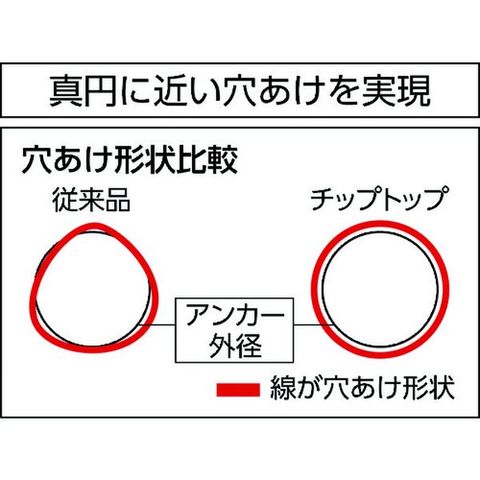 ・キャンドル形の超硬チップと刃先を薄くしたことにより、被削材を鋭く穿孔し、穴あけスピードが向上しました。・超硬チップ先端のセンターポイントが抜群の位置決め性能を発揮し、真円に近い穴あけが可能です。・センターポイントが穿孔中の芯振れを抑止し、作業中の振動負担を軽減します。