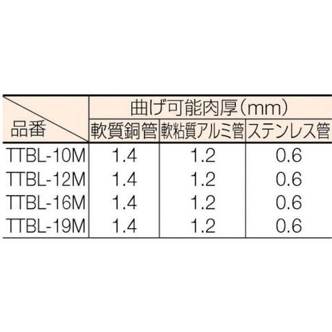 ・タイプ:ミリ用・適合管径(mm):12・曲げ半径R(mm):38・寸法(mm)左手:440・寸法(mm)右手:400・曲げ可能肉厚(mm)軟質銅管:1.4・曲げ角度(°):0~180・適合管径:12・曲げ可能肉厚(mm)軟粘質アルミ管:1.2