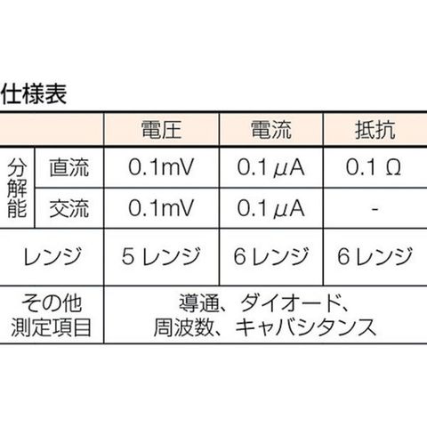 ・直流電圧(V):1000・交流電圧(V):1000・直流電流(A):10・交流電流(A):10・抵抗(Ω):60M・検波方式:真の実効値整流(RMS)・電源(V):単3乾電池(R6)×4本(付属)・電源:単3乾電池(R6)×4本(付属)・幅(mm):90・奥行(mm):49・高さ(mm):192・連続使用時間(h):約300・最大表示(カウント):6000