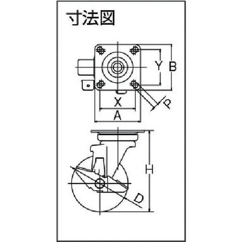 ・車輪径D(mm):100・タイプ:自在式(ストッパー付)・許容荷重(daN):100・許容荷重(kgf):102.0・車輪幅(mm):32・取付高H(mm):132・取付座A(mm):90・取付座B(mm):90・取付ピッチX(mm):68~71・取付ピッチY(mm):68~71・取付穴径P(mm):11・許容荷重(N):1000