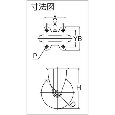 ・車輪径D(mm):75・タイプ:固定式・許容荷重(daN):70・許容荷重(kgf):71.4・車輪幅(mm):26・取付高H(mm):93・取付座A(mm):70・取付座B(mm):47・取付ピッチX(mm):55・取付ピッチY(mm):28・取付穴径P(mm):8.8