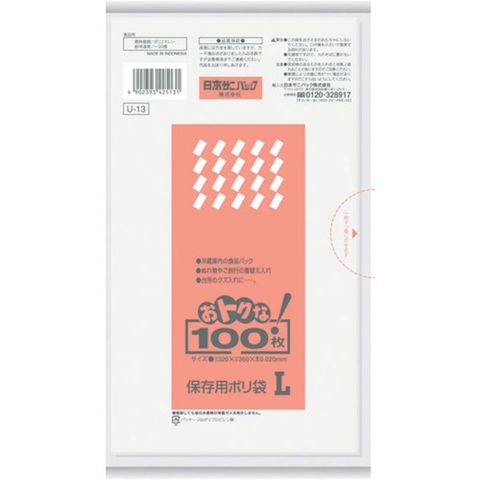 U13CL 日本サニパック(株) サニパック U-13おトクな!保存用ポリ袋L透明 100枚