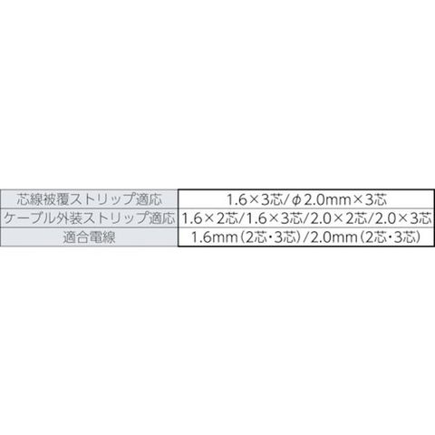 ・全長(mm):225・適合電線(mm):芯線被覆ストリップ:1.6mm×3、2.0mm×3・適合機種:VVFケーブル 切断能力:1.6mm(2芯・3芯)/2.0mm(2芯・3芯)・適合電線:ケーブル外装ストリップ:1.6mm(2芯・3芯)/2.0mm(2芯・3芯)・色:赤×黒