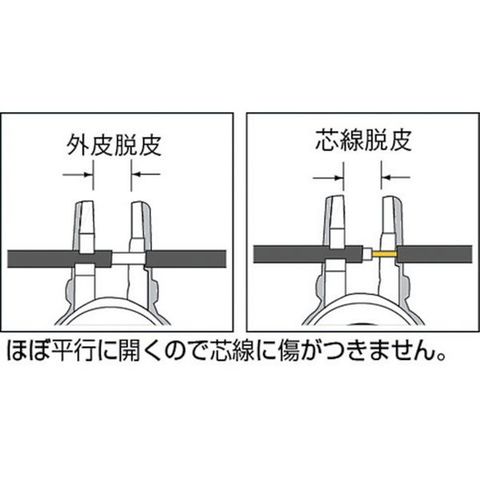 ・丸刃なので、外皮脱皮の切り口が美しいです。・特許新機構で、軽い力で脱皮できます。・刃の交換なしに4種類のVVF(φ1.6mmの2芯・3芯、2mmの2芯・3芯)の脱皮が可能です。