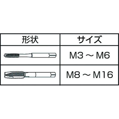 ・高級粉末ハイスと特殊コーティングで耐久力が向上しています。・独自の刃形状により切りくずの排出向上と切削抵抗を低減し、良好なめねじと工具寿命を実現しています。・適正な工具突出し量を確保し、良好な水溶性切削油剤の供給を実現しています。・水溶性切削油剤加工に最適です。
