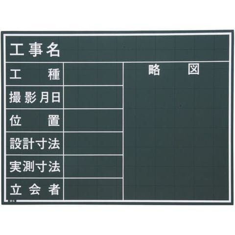 ・板面色:グリーン・縦(mm):450・横(mm):600・表示内容:工事名・工種・撮影月日・位置・設計寸法・実測寸法・立会者・略図・暗線:入り