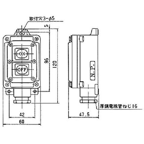 ・ボタン数:2点・ボタン文字:ON、OFF・長さ(mm):60・幅(mm):120・高さ(mm):47.5・端子ねじ:M3.5セルフアップねじ・適合電線([[MM2]]):1.25・長さx幅x高さ(mm):60x120x48・定格:AC250V-5A、AC500V-1A