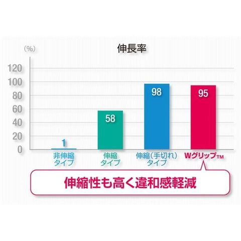 ・薄くて伸縮性のある基材の採用で、違和感が大幅に低減し抜群のフィット感を実現しています。・粘着剤を使用していないので、テープ重量が大幅に低減し、空気のような軽さと高い通気性を確保することで圧倒的なムレにくさを実現します。・縦糸にナイロンを採用したことで、薄くて軽いのに一定の強度を実現し、従来のテーピングと同等の強度をより薄く、より軽く仕上げることが可能です。