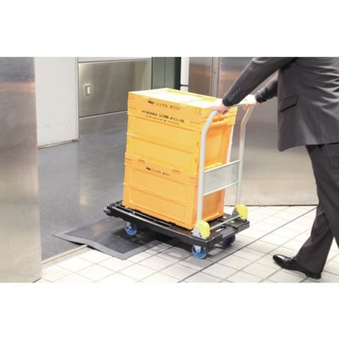・縁(ふち)に傾斜をつけたクッション性のあるゴムマットです。・段差や電気コードの上に敷くことで、台車がスムーズに乗り越え、作業者の負担と乗り越え時の音の軽減に繋がります。