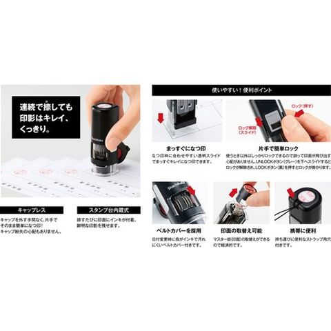 ・日付、名前、メッセージを一度に捺印できる、大きくて見やすいデータ印です。・キャップレスタイプですので、キャップを外す手間なく片手でそのまま捺印でき、キャップ紛失の心配もありません。・転写式キャップレス機構だから連続捺印性が向上しています。・スライドロック機構付きだから安心して持ち運ぶことができます。・印面はWebまたは同梱のハガキで簡単に注文できます。