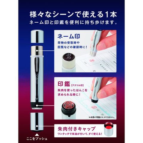 ・荷物の受取時にはネーム印、朱肉を使ったはんこが必要な時には印鑑といったように、さまざまなシーンで使い分けができる商品です。・印鑑のキャップには朱肉がセットされているので、ワンタッチですぐに使うことができます。・キャップ部に朱肉が内蔵されているので、別途朱肉の持ち運びは不要です。