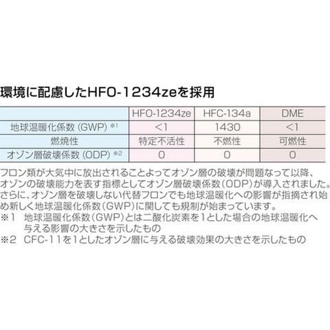 ・ノンフロン・GWP(地球温暖化係数):1未満・ODP(オゾン層破壊係数):0