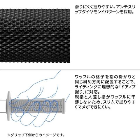 オフロードバイク用のスタンダードグリップとして設計された、トータルバランスに優れたオールラウンドグリップ。定番のハーフワッフルタイプを進化させ、握りやすさを向上し、無駄な力を必要としない事で腕上がりを軽減。
