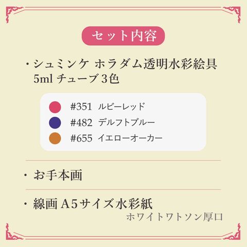 なつきセレクトシュミンケ ホラダム透明水彩絵具3色セットで着彩をした作品をQRコードより外部サイトにてご確認をいただけます。付属の線画の着彩見本としてご活用ください。実際に作家本人が着彩している動画は、早送りしていないため、筆使いや絵具の広がりが分かりやすく、一緒のペースで着彩が可能です。