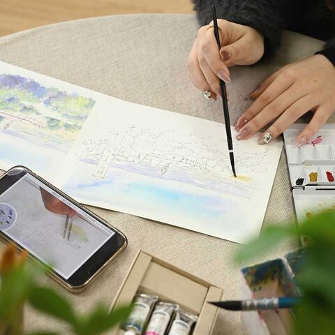野村重存セレクト透明水彩3色セットで着彩をし他創作過程をQRコードより外部サイトにてご確認をいただけます。 付属の線画の着彩見本としてご活用ください。 実際に野村氏本人が着彩している動画は、早送りをしていないため、筆使いや絵具の広がりが分かりやすく、一緒のペースで着彩が可能です。