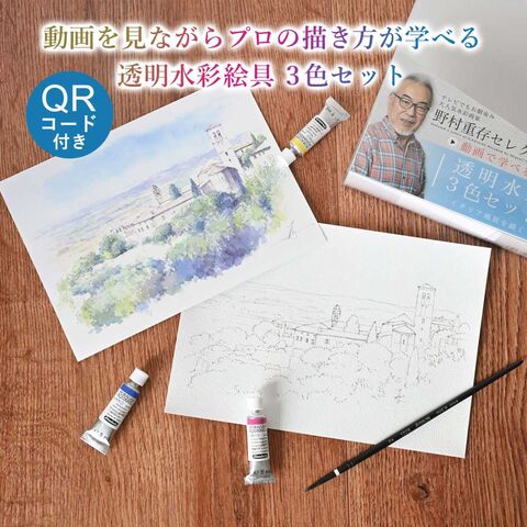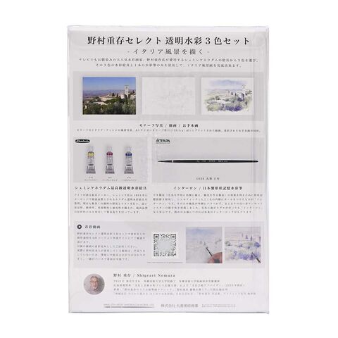 テレビでもお馴染みの大人気水彩画家、野村重存氏が愛用するシュミンケホラダムの絵具から3色を選び、その3色の水彩絵具と1本の水彩筆のみを使用して、イタリア風景画を完成できます。