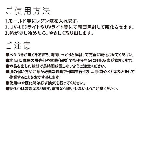 ※ 硬化直後は柔軟性がありますが、熱が取れて硬化反応が終わると硬く仕上がります。また、着色したレジンの薄い作品は、透明より柔らかく仕上がります。
