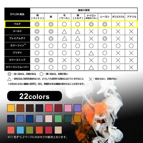 ・パッケージの色は白の綿の生地250gをマルチ1袋(濃色の染料は2袋)で染めた場合の色見本です。染める繊維の種類や染料の量、元の色などによって染め上がりの色は異なります。