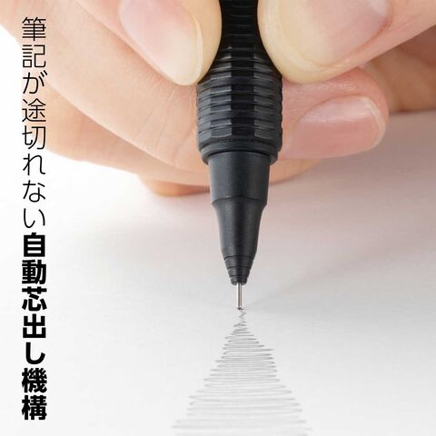 さらに、ペン先が紙面から離れるたびに、自動で芯が出てくる機構を搭載し、最初のワンノックだけで、残り芯が短くなるまで書き続けられます。
