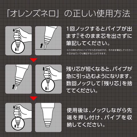 パイプで芯を守って書く!芯の折れない「オレンズシステム」と、ペン先を離すたびに芯が出てくる!ノック不要の「自動芯出し機構」を搭載。