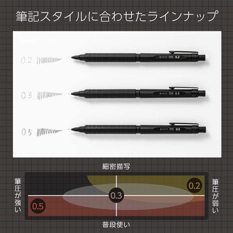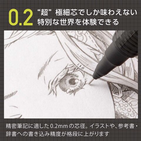 0.2mmの極細芯でさえ折れない「オレンズシステム」に加え、ペン先を紙面から離すたびに芯が出てくる「自動芯出し機構」を新たに搭載。