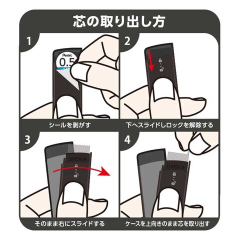 ケースを上向きのまま片手で操作できるから、芯をこぼすリスクを減らせます。