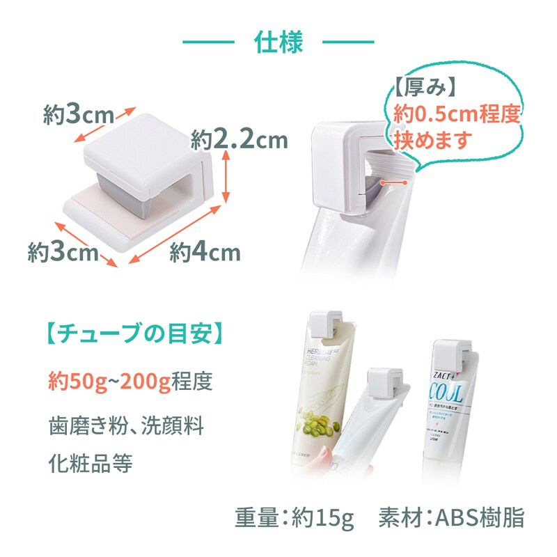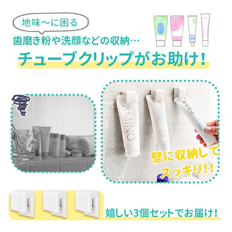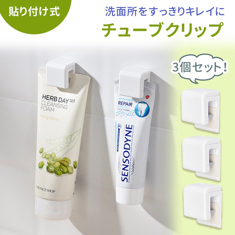 チューブクリップ 3個セット クリップ チューブ 歯磨き粉 洗顔料 タオル 粘着 粘着シート 片付け 収納 壁に固定 挟む 貼り付け式 洗面所 バスルーム 便利グッズ アイデア商品 浮かせる収納 収納術