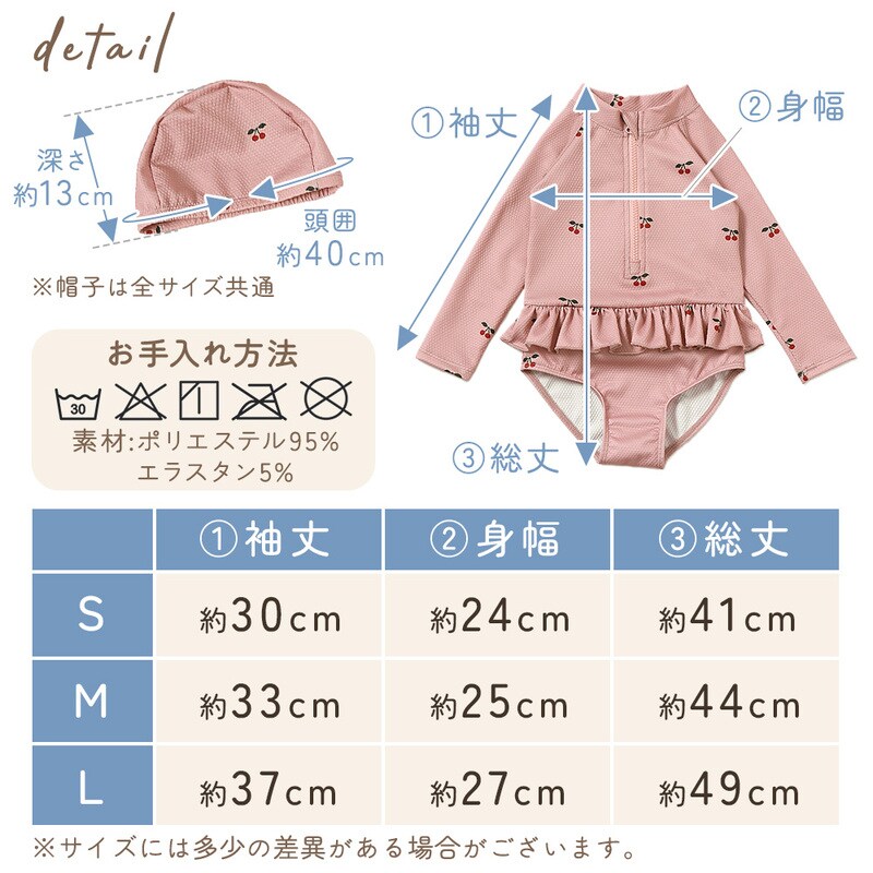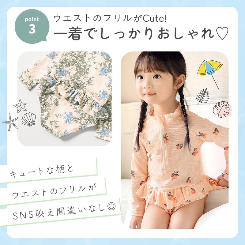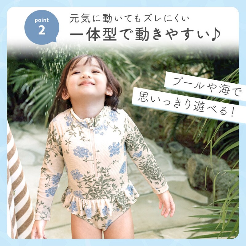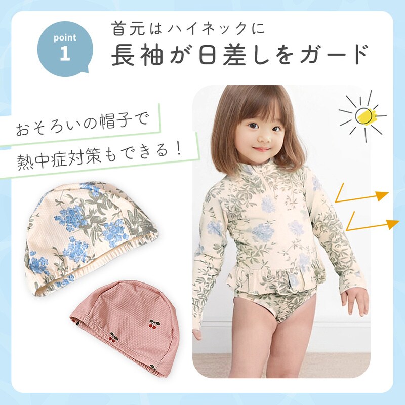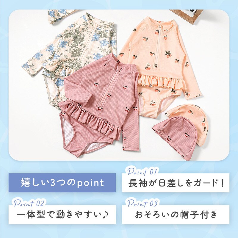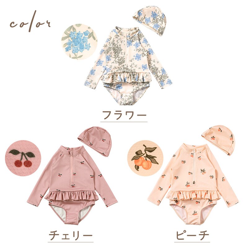 フリルラッシュガード 2点セット ベビー キッズ こども 女の子 男の子 水着 長袖 上下 スイムキャップ付き 日焼け防止 UV対策 夏 海 プール 水遊び かわいい おしゃれ 紫外線 幼稚園 ファスナー 80 90 100フラワー M