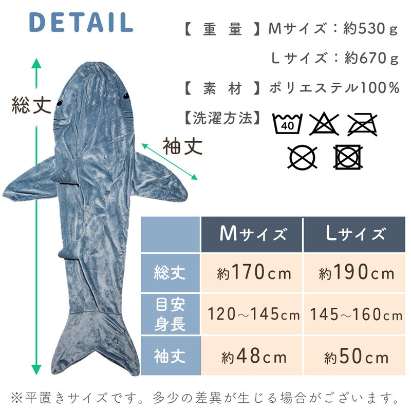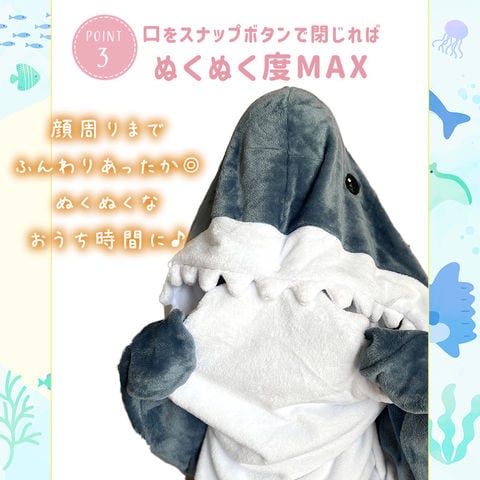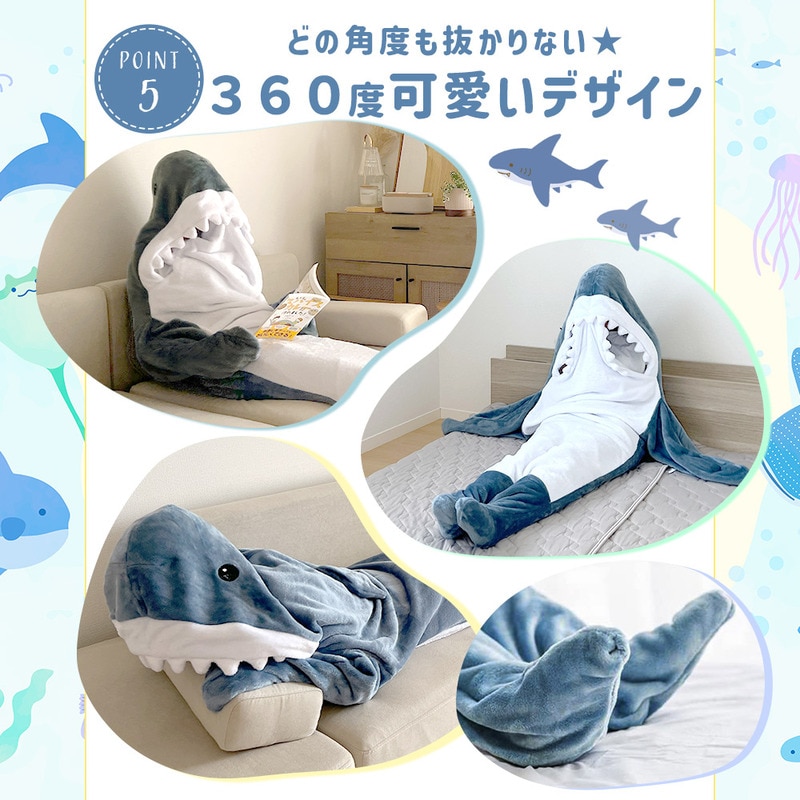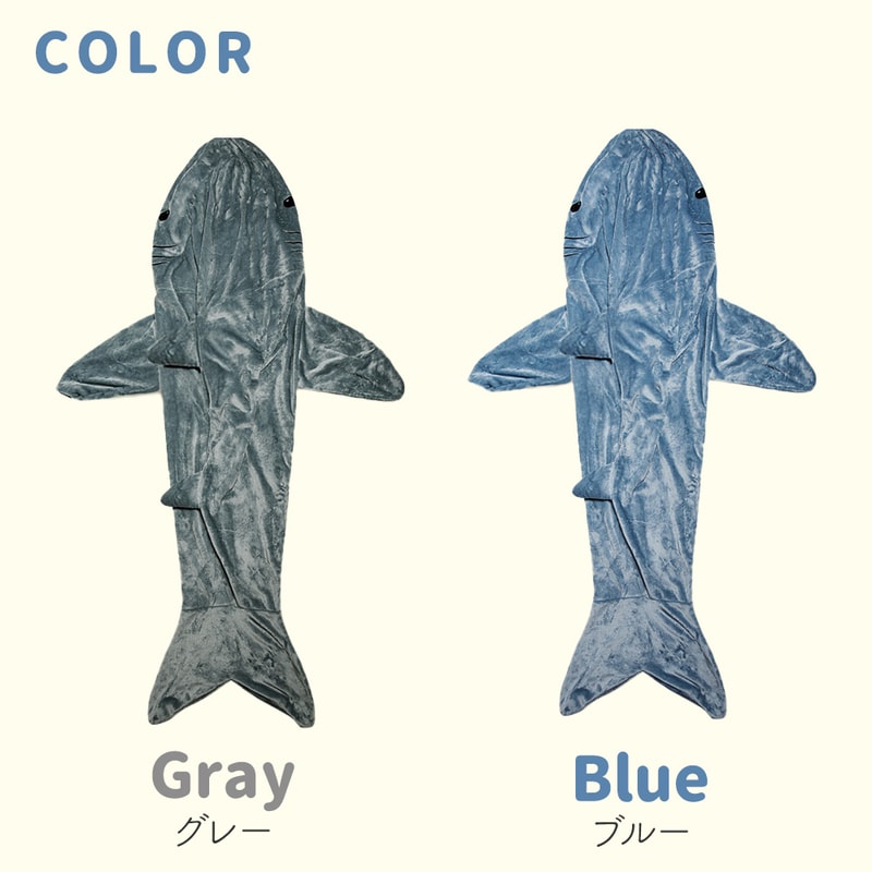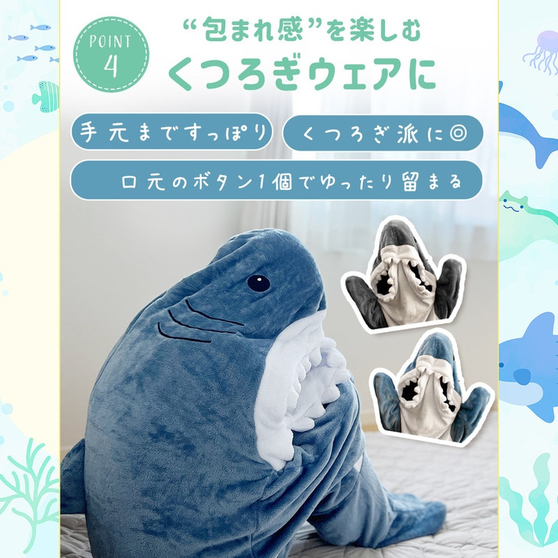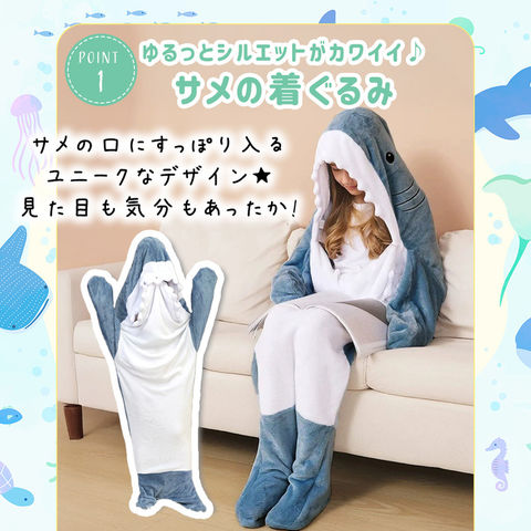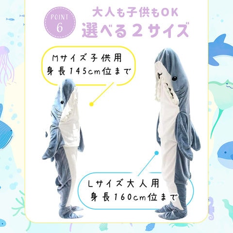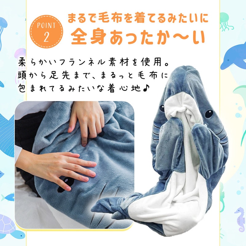 サメ寝袋 ブルー Lサイズ 冬 あったか ふわもこ 着る毛布 フード付き 袖あり シュラフ ブランケット 毛布 防寒 軽量 フランネル ポリエステル 足ポケット 全身 かわいい 子供用 大人用 M L 洗濯機OK 車中泊 リラックス あったか 口元スナップボタン